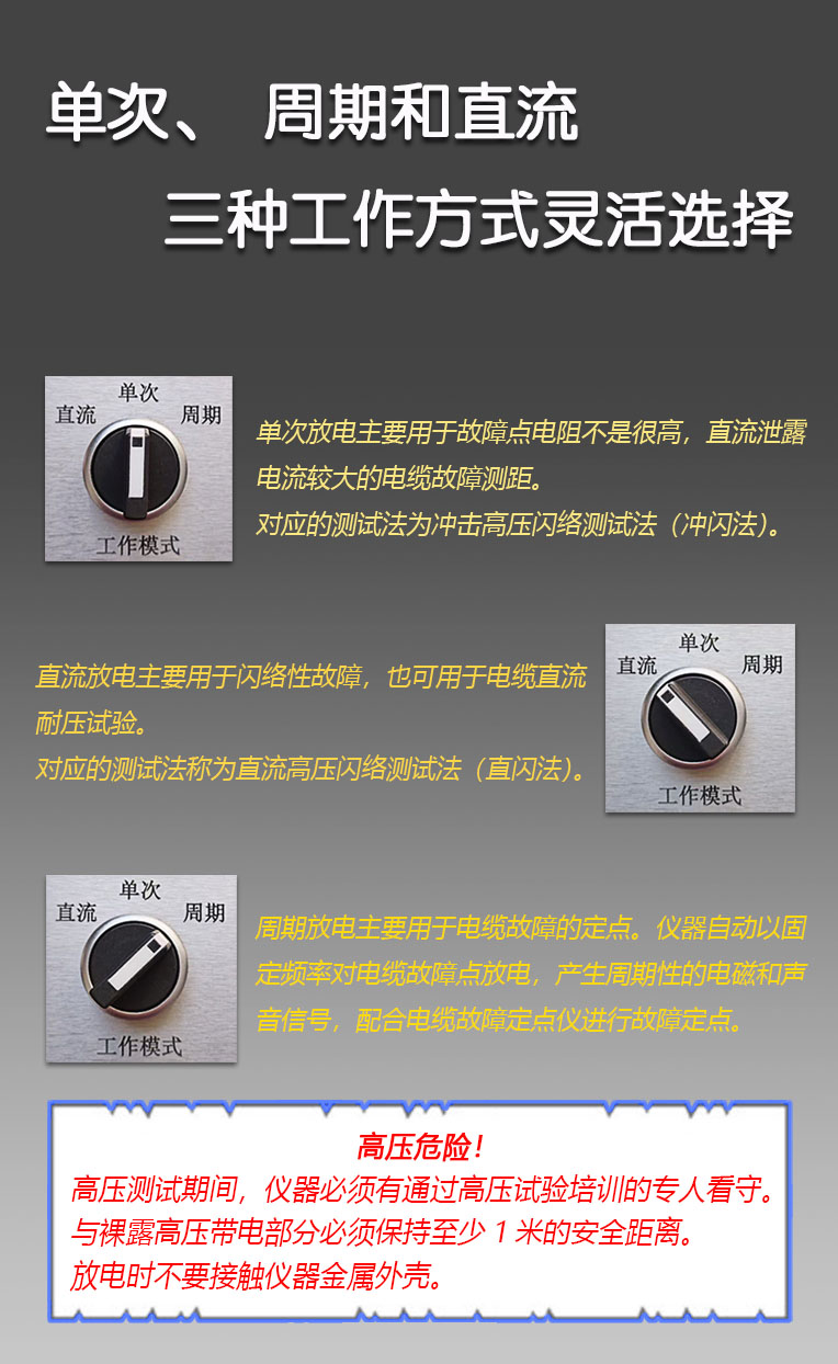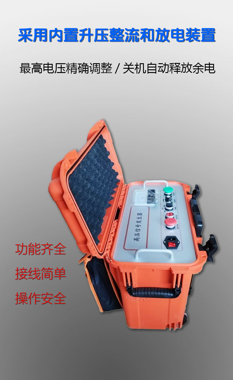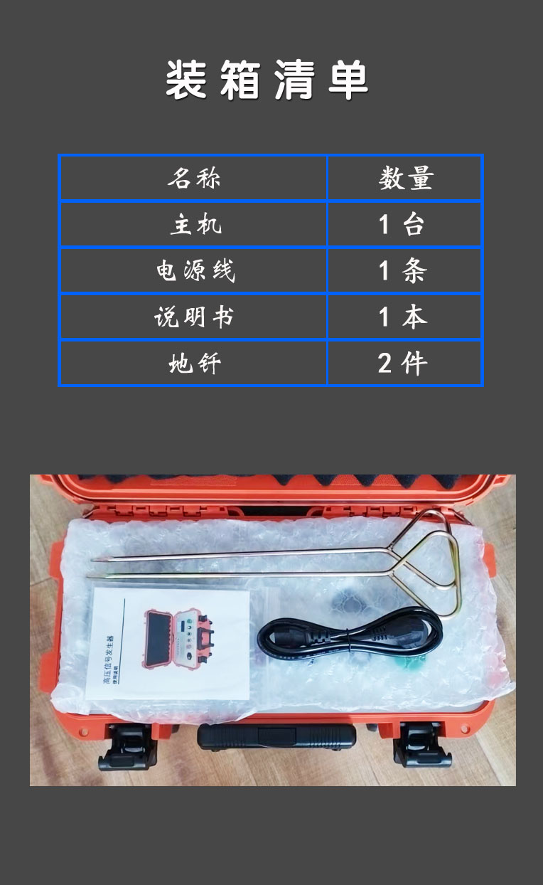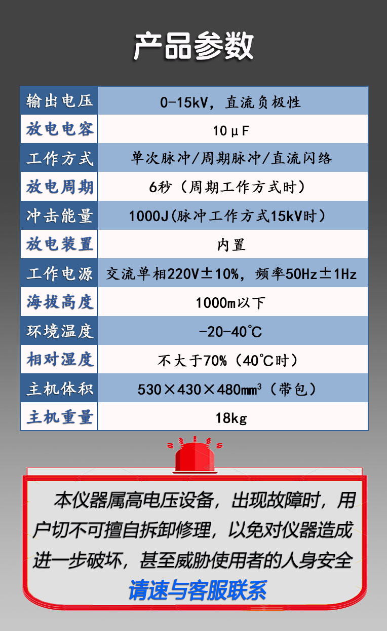 高压信号发生器-详情 信号发生器主机|电源线|电源适配器|高压输出连接|说明书 政策条例 您必须遵守相关政策,严禁下载本站一切图片素材。 最终解释权归淄博特力电子技术有限公司所有 产品特点 一键放电按钮,安全防护开合式机体,方便携带 技术指标 输出电压:0--15kV,直流负极性内置电容:3uF/6uF工作方式:直流脉冲放电周期:通过调整球间隙调整放电周期冲击能量:330J/660J工作电源:交流单相 220V±10%,频率 50Hz±1Hz海拔高度:4000m 以下环境温度:0-40℃相对湿度:不大于70%(40℃时)主机体积:385*255*255(W*D*H,mm)主机重量:10kg