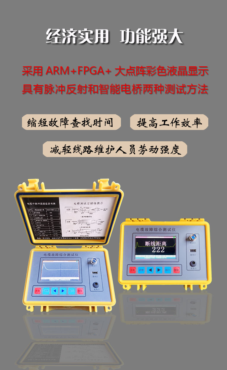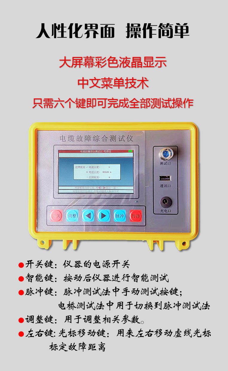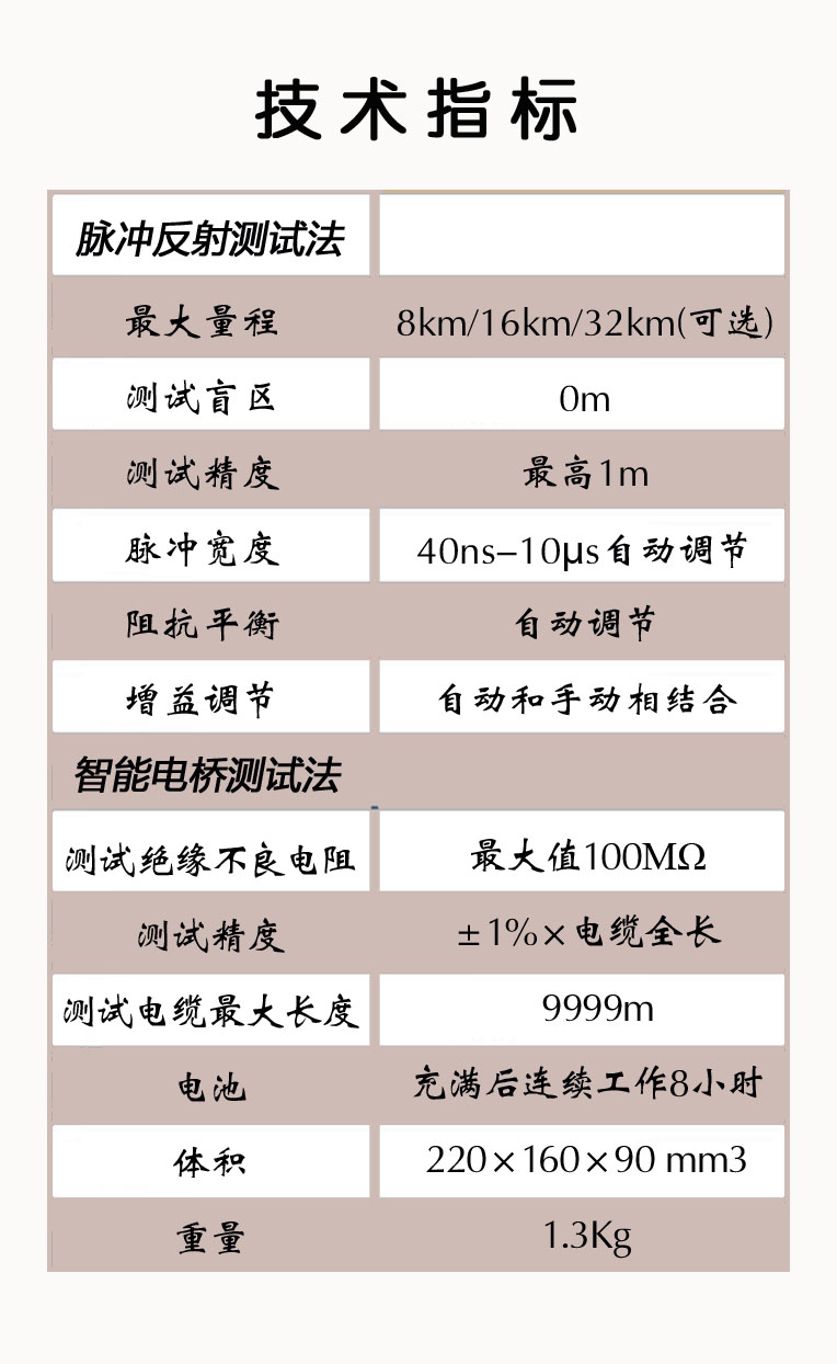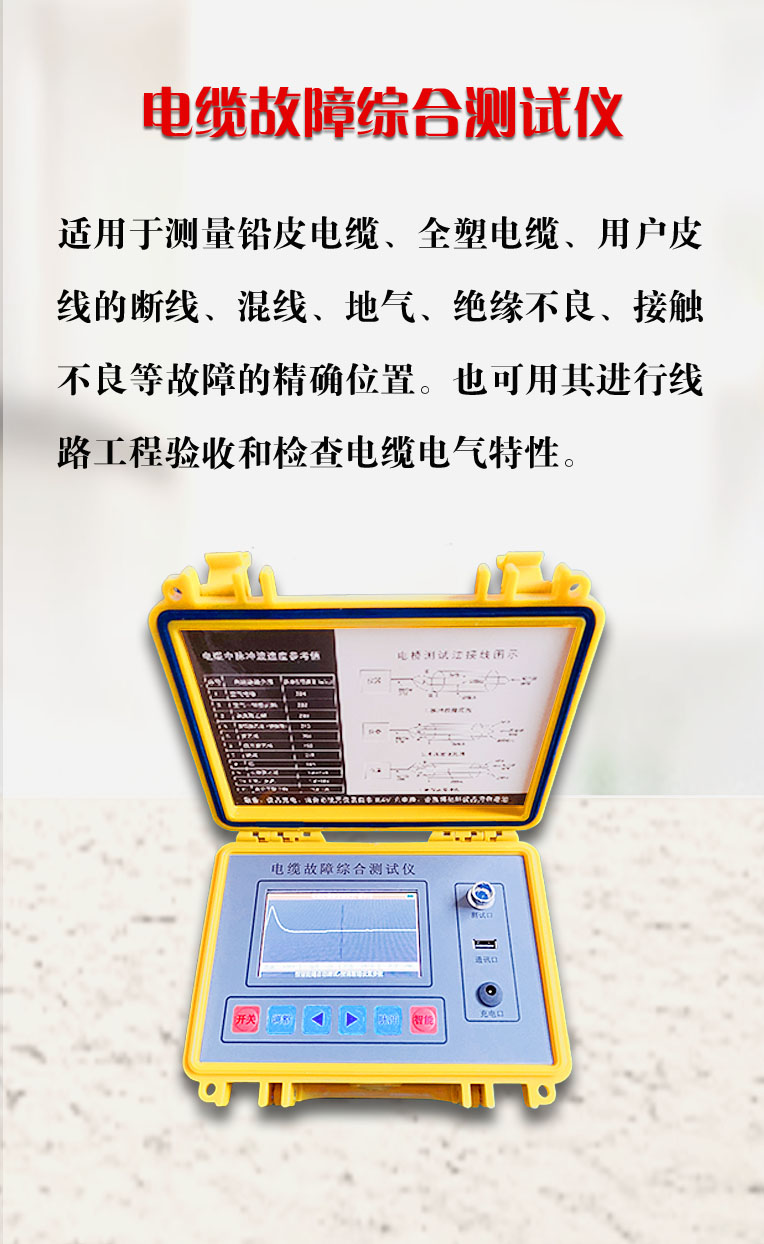 电缆故障综合测试仪-详情 主机|充电器|产品说明书|测试引导线|U盘(选配)|光盘(选配)|仪器背包 政策条例 您必须遵守相关政策,严禁下载本站一切图片素材。 最终解释权归淄博特力电子技术有限公司所有 产品特点 1、大屏幕彩色液晶显示(480*280 点阵),人性化界面中文菜单设计,只需六个键,即可完成全部测试操作。 2、结合了脉冲反射测试法和智能电桥测试法,可以测试断线、混线、绝缘不良等各种类型的故障 3、保留有手动测试功能。 4、采用中文菜单技术,易于掌握和使用。 5、具有兆欧表和欧姆表功能,能够测试绝缘电阻和环路电阻。 6、带有 USB 接口,可将测试数据存入 U 盘,在计算机上分析处理。(选配) 7、采用可充电锂电池,智能充电,无需值守。 8、体积小,重量轻,便于携带。 技术指标 1.脉冲反射测试法: ⚫ 最大量程:8km/16km/32km(可选) ⚫ 测试盲区:0m ⚫ 测试精度:最高 1m ⚫ 脉冲宽度:40ns-10μs 自动调节 ⚫ 阻抗平衡自动调节 ⚫ 增益调节:自动和手动相结合 2.智能电桥测试法: ⚫ 能够测试绝缘不良电阻最大值:100МΩ ⚫ 测试精度:±1%×电缆全长 ⚫ 测试电缆最大长度: 9999m 3. 仪器 ⚫ 充电时间约 4 小时 ⚫ 充满后连续工作时间 8 小时 ⚫ 体积:220×160×90 mm3 ⚫ 重量:1.3Kg