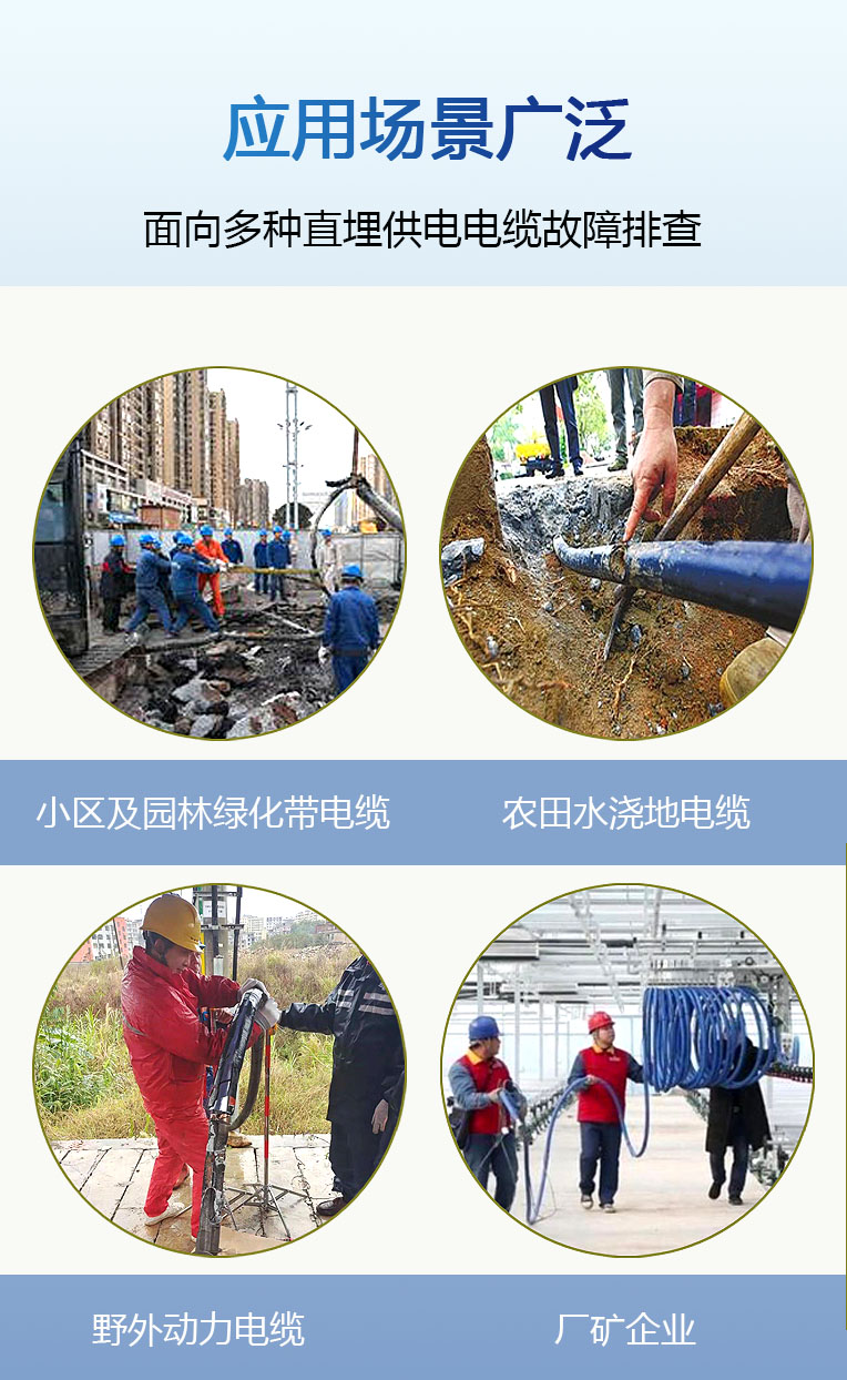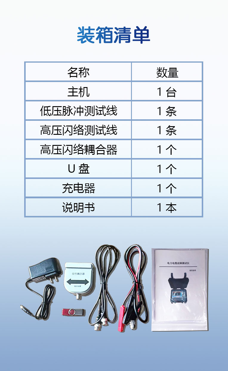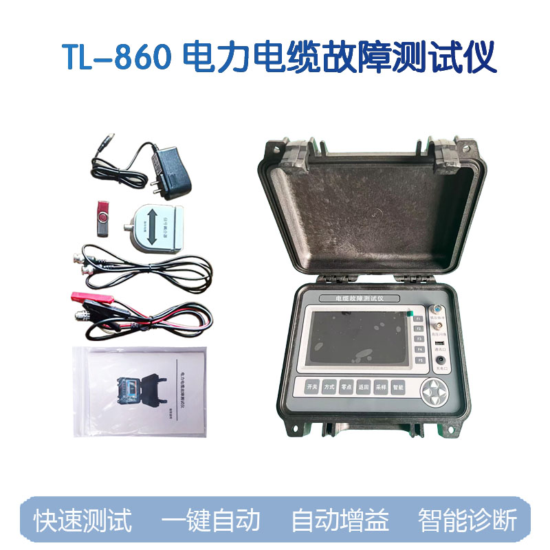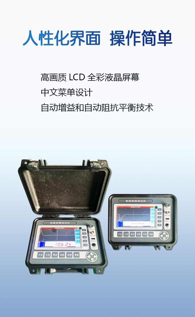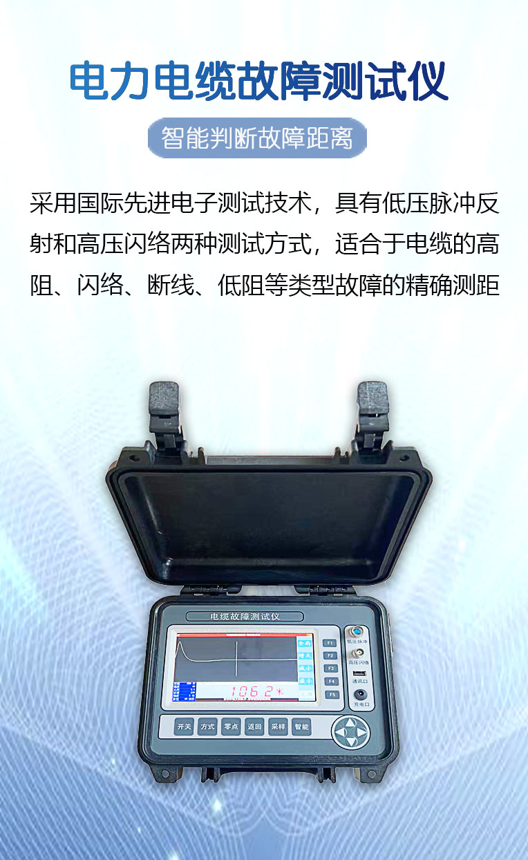 电力电缆故障测距仪(便携)-详情 电力电缆故障测距仪主机|低压脉冲测试线|脉冲电流测试线|脉冲电流耦合器|U盘|充电器|说明书 政策条例 您必须遵守相关政策,严禁下载本站一切图片素材。 最终解释权归淄博特力电子技术有限公司所有 产品特点 1、结合了低压脉冲反射和高压闪络两种测试方式,可以测试断线、低阻、高阻、闪络等故障。2、智能判断故障距离。低压脉冲下能自动判断故障点距离。高压闪络方式下自动判断故障点的距离。3、测试精度高,在量程小于1km时测试精度小于±1m;在量程大于1km时,测试精度小于0.5%。4、采用中文菜单技术,易于掌握和使用。5、采用7寸高画质LCD全彩液晶屏幕6、采用可充锂离子电池,自动充电管理。7、体积小,重量轻,便于携带。 技术指标 最大测试距离: 32km测试精度: 测试距离小于1km时,测试误差不大于±0.5m 测试距离大于1km时,测试误差不大于0.5%测试盲区:0m脉冲宽度:10ns-10μs阻抗平衡自动调节增益调节:自动和手动相结合功耗:2W可连续工作时间大于10小时使用环境温度:-10℃ -- +40℃体积:270×246×123 mm3重量:2kg