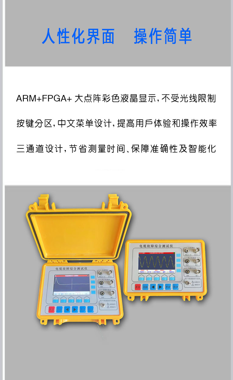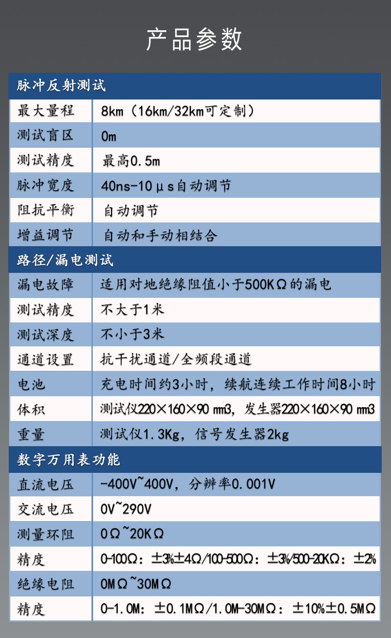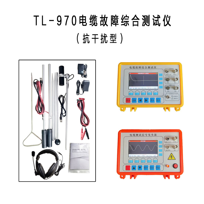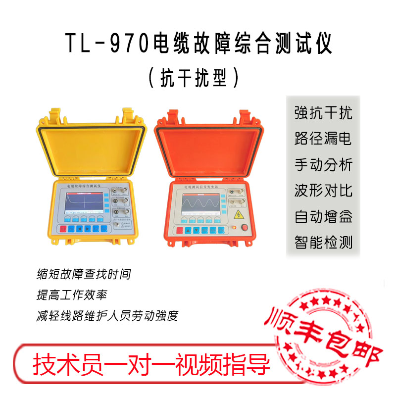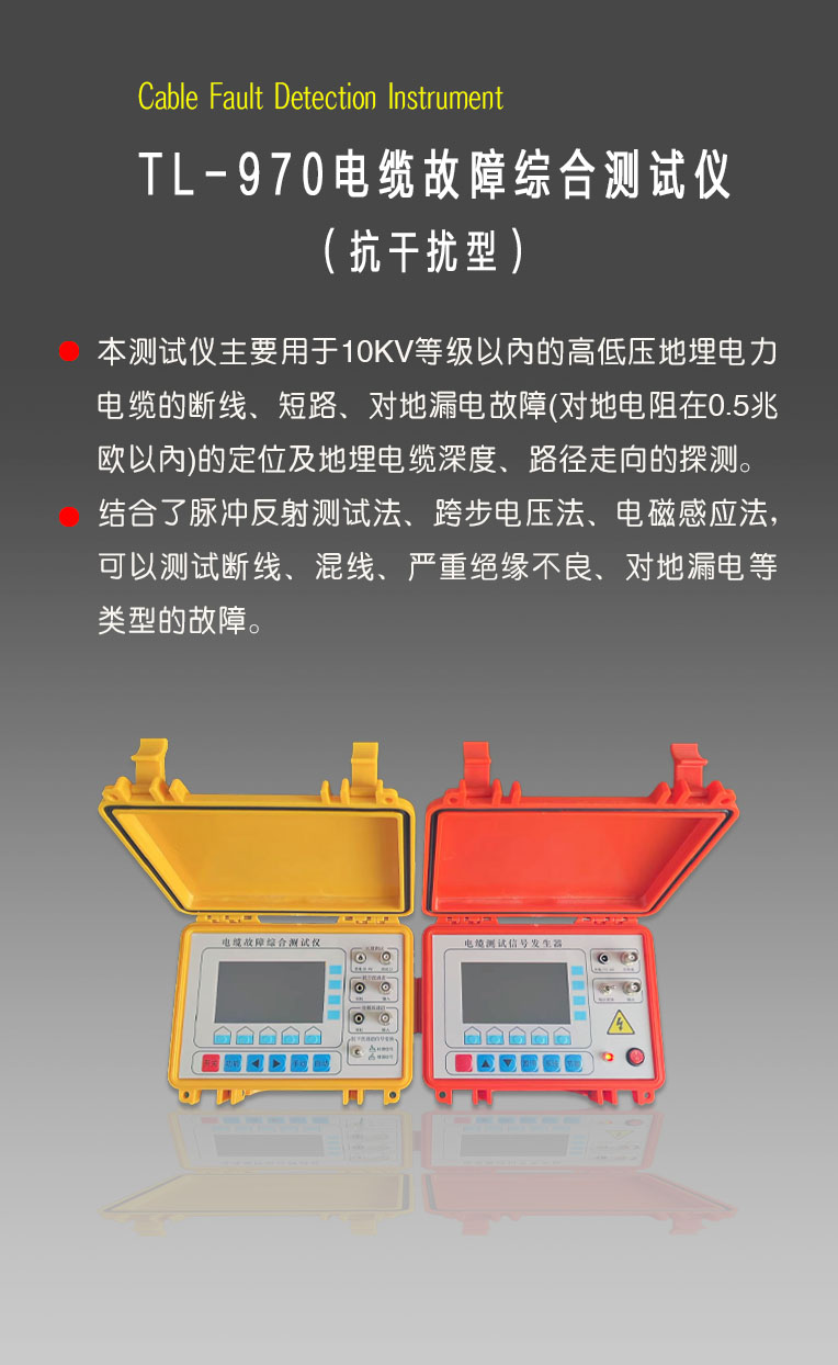 电缆故障综合测试仪(抗干扰型)-详情 产品可选配置: 测量距离可选: 1KM 2KM 4KM 8KM 16KM 32KM 测试仪|长度测试线|耳机|漏电信号采集探杆|路径信号采集探头|信号发生器|信号发生器连接线|地钎|仪器包+配件包|测试仪充电器|信号发生器充电器|说明书+合格证 政策条例 您必须遵守相关政策,严禁下载本站一切图片素材。 最终解释权归淄博特力电子技术有限公司所有 产品特点 ● 大屏幕彩色液晶显示,不论白天还是夜晚都清晰可见。人性化界面中文菜单设计,按键分区,设计更人性化,让用户更好操作机器 。● 增加专用抗干扰线路板,软硬件结合,更强抗干扰● 优化产品算法,加强抗干扰能力,使用更高效快捷。● 结合了脉冲反射测试法、跨步电压法、电磁感应法,可以测试断线、混线、严重绝缘不良、对地漏电等类型的故障。● 保留有手动分析功能,可以选择不同的测试范围分析故障波形。● 波形对比功能,可以同时显示2个波形,通过对比好线和故障线波形的差异确定故障位置。● 采用自动增益和自动阻抗平衡技术,替代繁琐的电位器调节。● 配合信号发生器探测铠装地埋电缆准确走向及对地漏电位置。● 采用可充电锂电池,智能充电,无需值守。● 体积小,重量轻,便于携带。 技术指标 1. 脉冲反射测试法:● 最大量程:8km(16km/32km可定制)● 测试盲区:0m● 测试精度:最高0.5m● 脉冲宽度:40ns-10μs自动调节● 阻抗平衡自动调节● 增益调节:自动和手动相结合2. 路径/漏电测试单元:● 适用对地绝缘阻值小于500KΩ的漏电(相地、相铠、相间绝缘不良)故障。● 测试精度:不大于1米。● 测试电缆地埋深度不小于3米;● 双通道设置:抗干扰模式只能在抗干扰通道使用。1)抗干扰通道:内部采用了高性能滤波电路,可以和探杆配合测试直埋电缆漏电位置,也可和探头配合测试线路的路径走向和漏电位置。2)全频段通道:内部采用了全频接收电路,可以和探杆配合测试直埋电缆漏电位置。● 充电时间约3小时,充满后连续工作时间8小时● 体积:测试仪220×160×90 mm3,信号发生器220×160×90 mm3● 重量:测试仪1.3Kg,信号发生器2kg3. 数字万用表功能: ● 直流电压:-400V~400V,分辨率0.001V● 交流电压:0V~290V● 测量环阻:0Ω~20KΩ● 精度:0-100Ω:±3%±4Ω 100-500Ω:±3% 500-20KΩ:±2%● 绝缘电阻:0MΩ~30MΩ● 精度0-1.0M:±0.1MΩ 1.0M-30MΩ:±10%±0.5MΩ